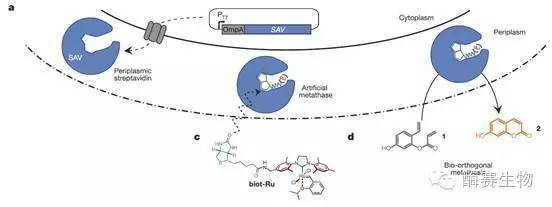 根據這篇文章報道,作者合成人工輔酶(以釕為中心的催化劑分子衍生的生物素,Biot-Ru),再將此人工輔酶與鏈霉親和素(Streptavidin,SAV)結合而形成了人工金屬輔酶。這種方法依賴于鏈霉親和素與生物素的高親和力,間接把帶有釕催化劑的生物素衍生物引入蛋白質。 通過周質蛋白表達以及外置的人工輔酶,作者成功在活細胞內實現有機金屬酶的正常運作。