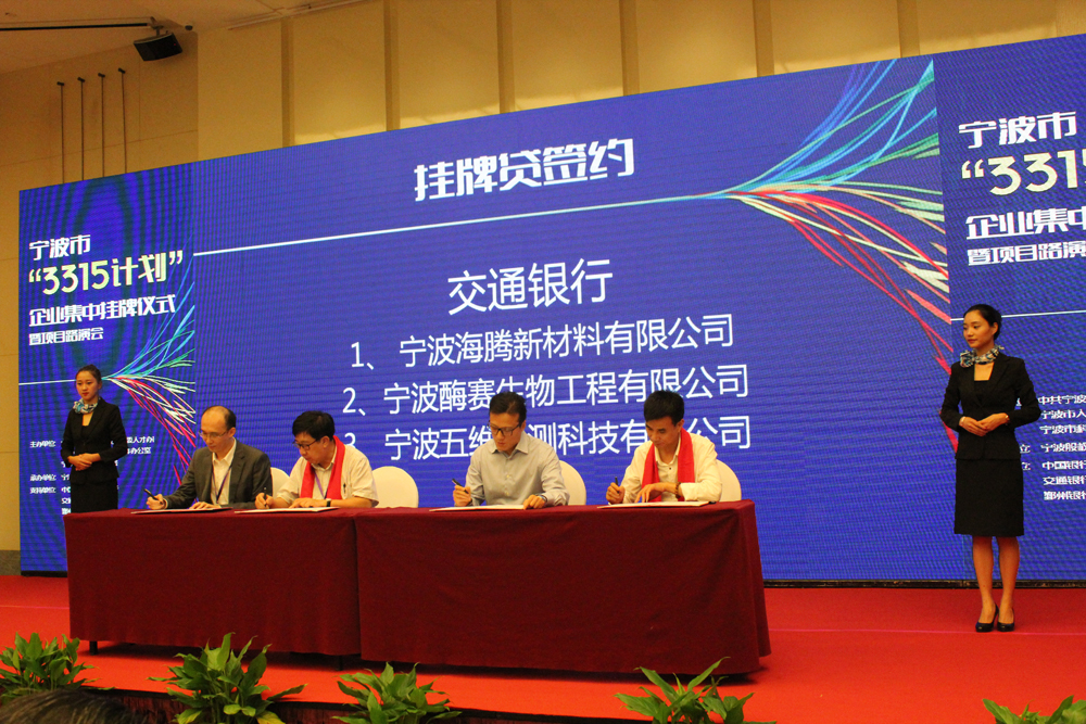 當天共22家“3315”企業正式在甬股交所掛牌,我司董事長黃勇開博士和總經理呂震林先生參加了此次活動,黃董事長參加了敲響鑼鼓的儀式。下午還舉行了“3315計劃”企業授信簽約儀式,寧波酶賽生物工程有限公司與交通銀行簽訂了授信協議。