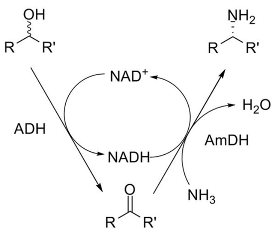 尼古拉斯·特納教授和他的同事,上個月在《Science》上發表了他們最新的研究結果,是一種醇脫氫酶(ADH)和氨脫氫酶的組合,用于將消旋醇轉化為手性氨。此反應在將醇轉換成酮的過程中生成一個NADH,而在后續的還原胺化反應中NADH重新變成NAD+。
