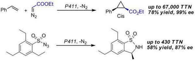 有研究找到了全新的亞鐵血紅素酶催化反應類型。由弗朗西斯·阿諾德、佩德羅·科埃略和他們的同事們發表在Science的一篇文章揭露了這個驚人的發現,P450工程酶可以通過卡賓轉移至烯烴而催化環丙烷化反應。以重氮作為卡賓的前體,不少的亞鐵血紅素酶可以將烯烴(如苯乙烯)轉化為手性環丙烷。在重氮乙酸乙酯和苯乙烯反應的過程中,不同的酶能產生不同程度的立體結構選擇性。通過巨大芽孢桿菌中的細胞色素P450酶進一步研究發現,通過對酶的關鍵結構的突變提高了反應的產率和立體選擇性。苯乙烯上的取代基團可以有多種可能,甚至1-甲基苯乙烯也能夠被酶接受。